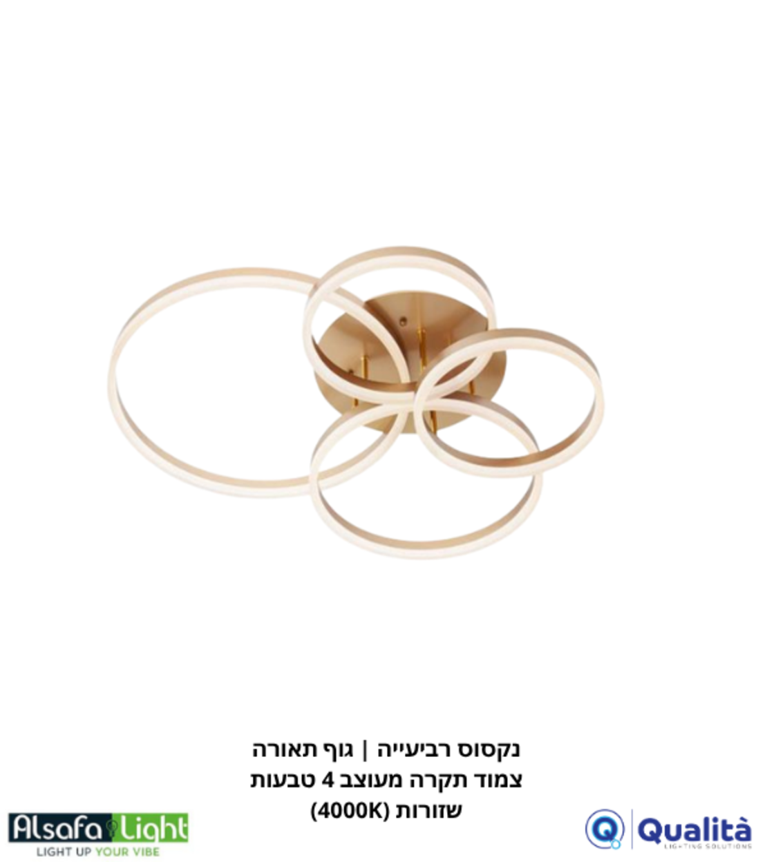 "נקסוס רביעייה" היא גרסה גדולה ומרשימה בסדרת גופי התאורה צמודי התקרה, המציגה קומפוזיציה דינמית ופיסולית של ארבע טבעות אור השלובות זו בזו. גוף תאורה זה הוא פריט הצהרתי שנועד להעניק נוכחות יוקרתית ומודרנית לחללים גדולים.