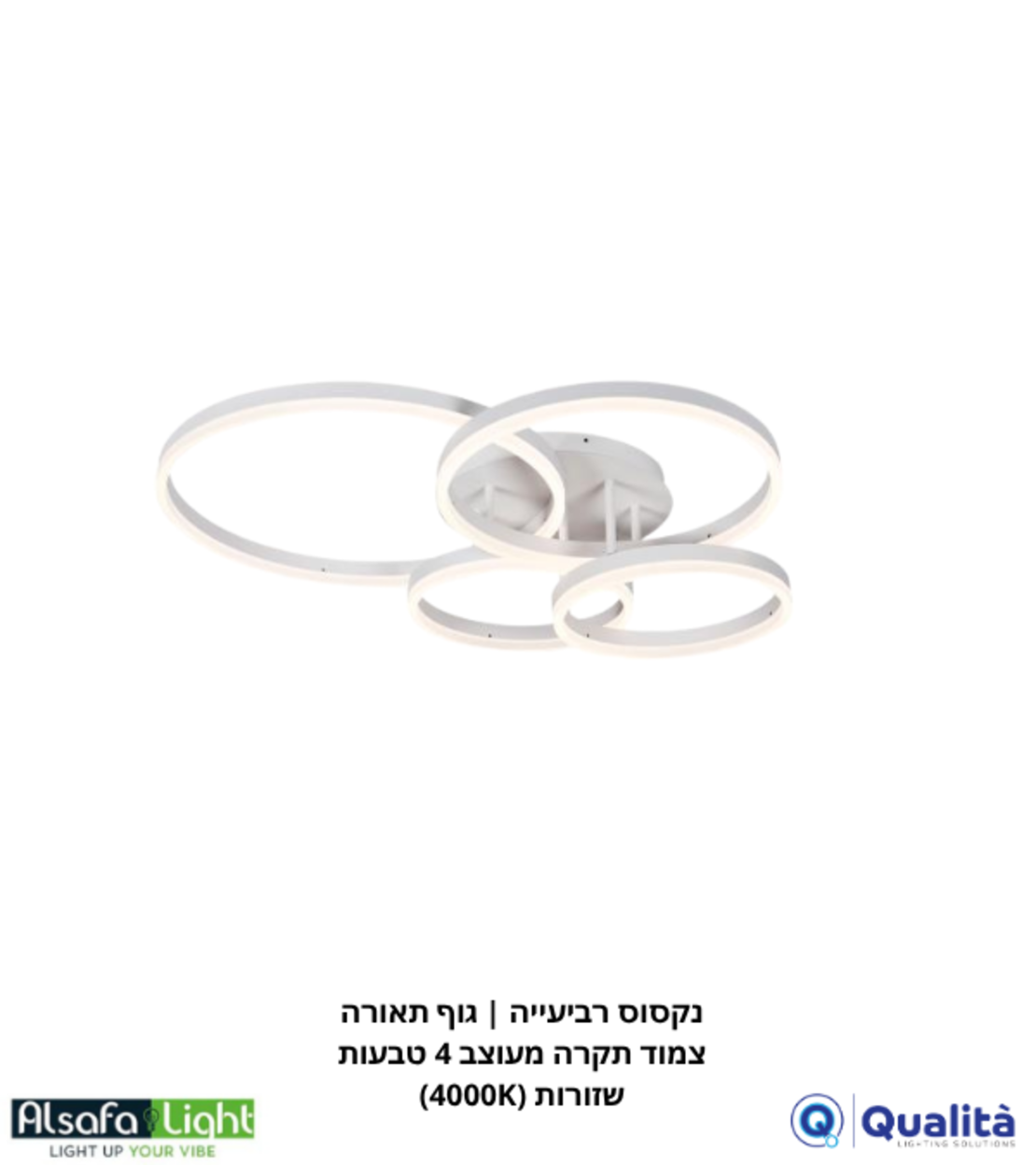 "נקסוס רביעייה" מפיק אור בגוון 4000K (לבן ניטרלי), המאיר את החלל באור נקי, טבעי ובהיר. גוון אור זה אידיאלי ליצירת אווירה פתוחה, רחבה ומודרנית, והוא מתאים במיוחד לחללי מגורים מרווחים, חללים מסחריים ומשרדים. האור מתפזר באופן אחיד ומלטף, מדגיש את קווי המתאר של הטבעות ומעניק עומק ויזואלי לחלל.